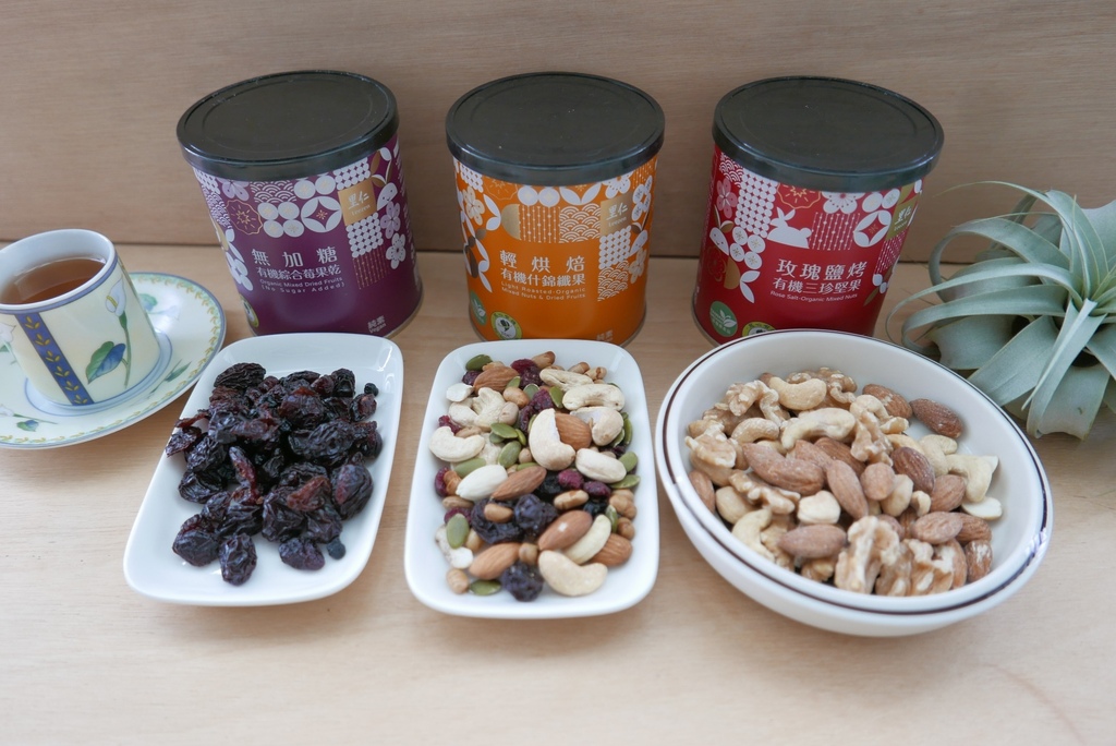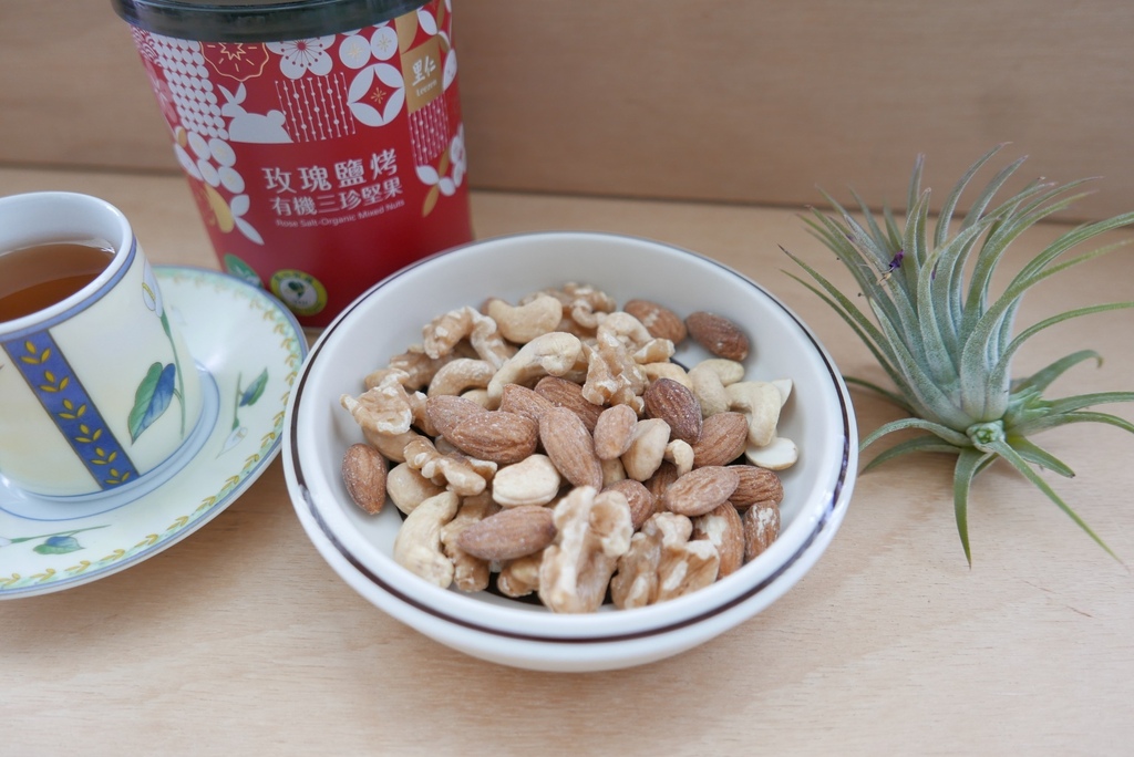 紅色是玫瑰鹽烤有機三珍堅果,有腰果、核桃、杏仁、玫瑰鹽