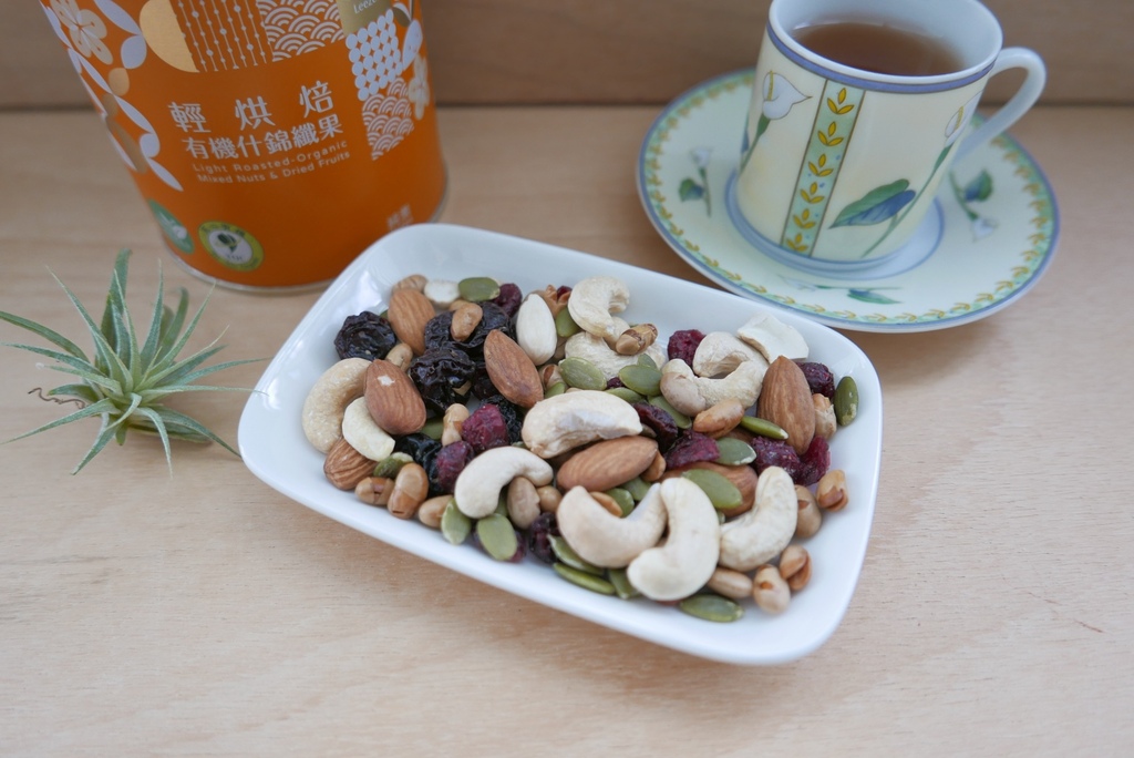 黃色是輕烘焙有機什錦纖果,有南瓜子仁、炒黃豆、腰果、杏仁、切片蔓越莓乾、葡萄乾、湖鹽