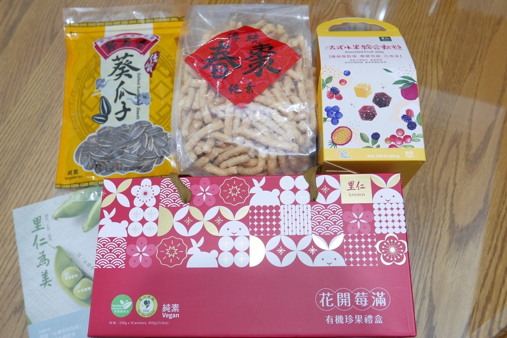 這次要介紹的是花開莓滿 有機珍果禮盒、法式水果綜合軟糖、葵瓜子、春棗~