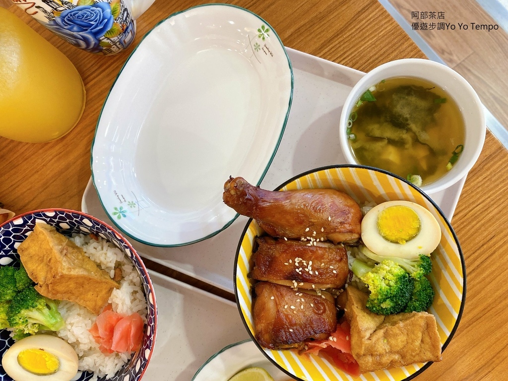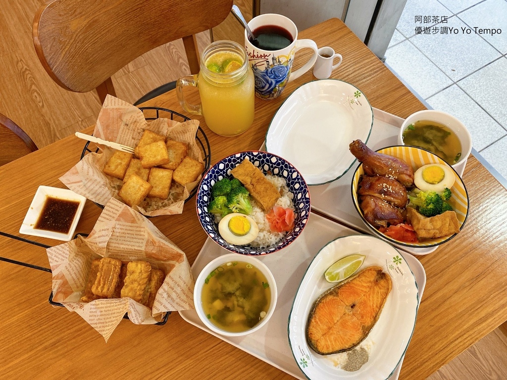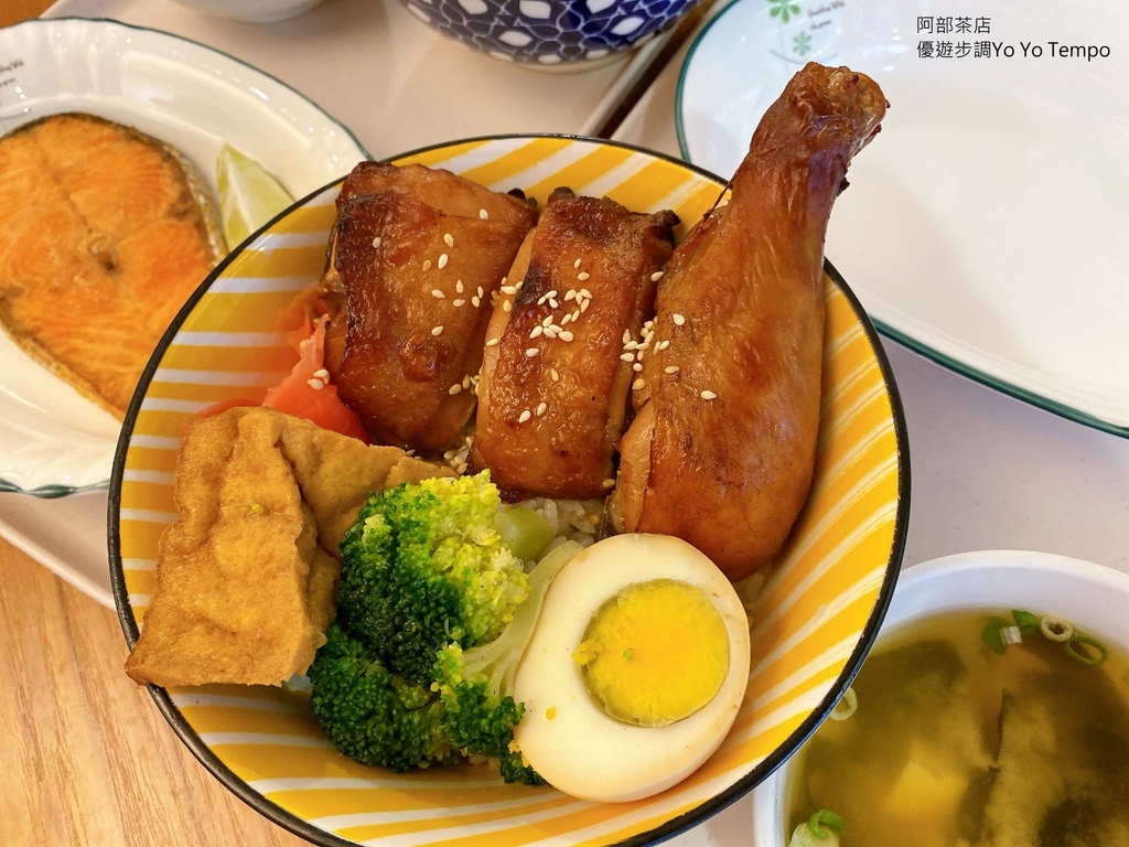 阿部茶店的蜜汁雞腿飯是一道視覺與味覺兼具的招牌主餐,可以看到表皮金黃發亮的雞腿經過慢火炙燒,塗上獨門蜜汁,入口帶有一股日式照燒的甜香,外皮焦脆、內裡軟嫩多汁,餐點還有搭配軟Q白飯與水煮蛋、川燙花椰菜與豆腐,豐富又營養,是台中茶餐中極具水準的選擇。