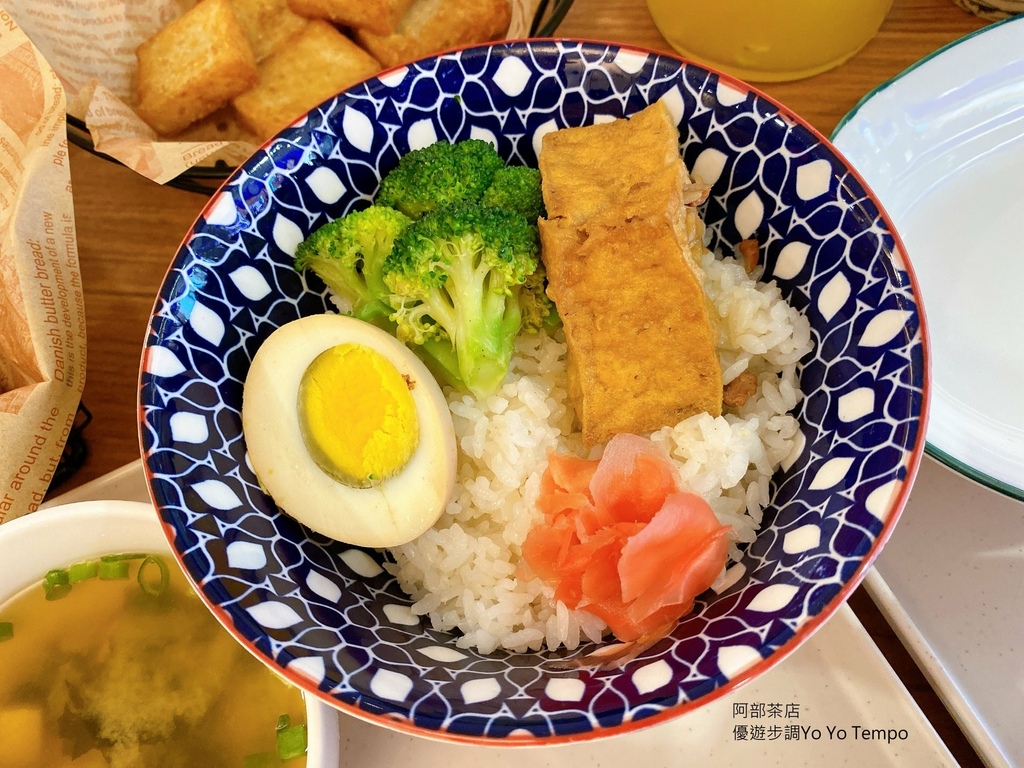 絕對不能錯過這道炙燒鮭魚飯,阿部茶店精選鮭魚排,外皮略為焦香、油脂豐厚,魚肉新嫩,口感滑順,還有搭配清爽米飯與時蔬,還附上一碗味噌湯,整體份量剛剛好,吃起來不膩口,是夏天也適合享用的餐點。
